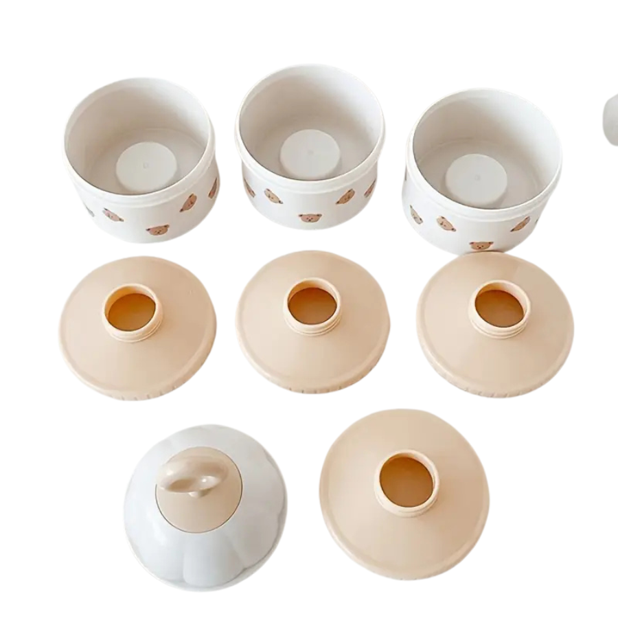 Ten praktyczny zestaw trzech pojemniczków umożliwia wygodne porcjowanie mleka modyfikowanego, kaszki lub innych sypkich produktów. Każdy pojemnik ma osobną pokrywkę i można je skręcać jeden na drugim – dzięki temu zajmują mało miejsca i są gotowe do użycia w każdej chwili. Całość zdobi uroczy motyw misia, który wprowadza odrobinę ciepła do codziennej rutyny.